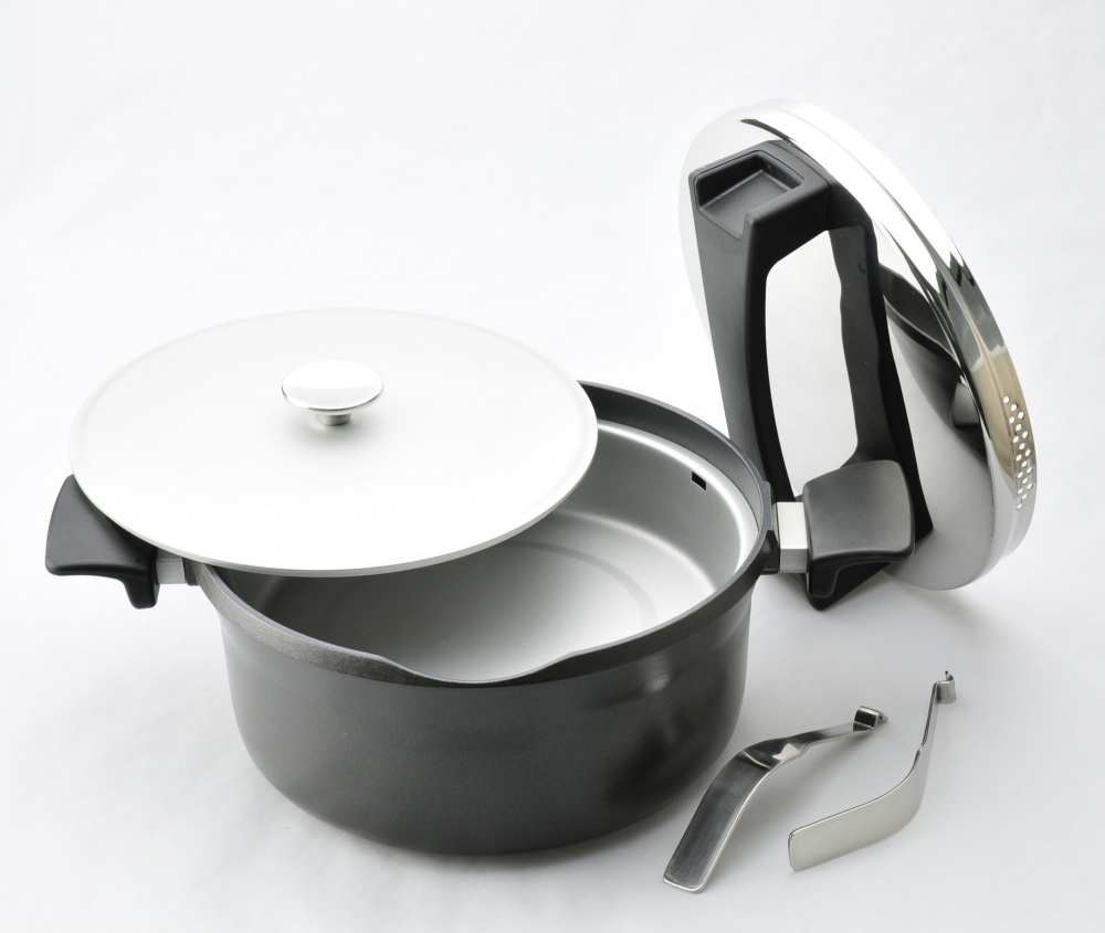 □なべ 本体:アルミニウム合金(底の厚さ4.3mm) 貼り底部:ステンレス鋼(厚さ0.8mm) ハンドル:フェノール樹脂 □外フタ 本体:ステンレス鋼 ツマミ:フェノール樹脂 □中フタ 本体:アルミニウム合金 ツマミ:ステンレス鋼 |